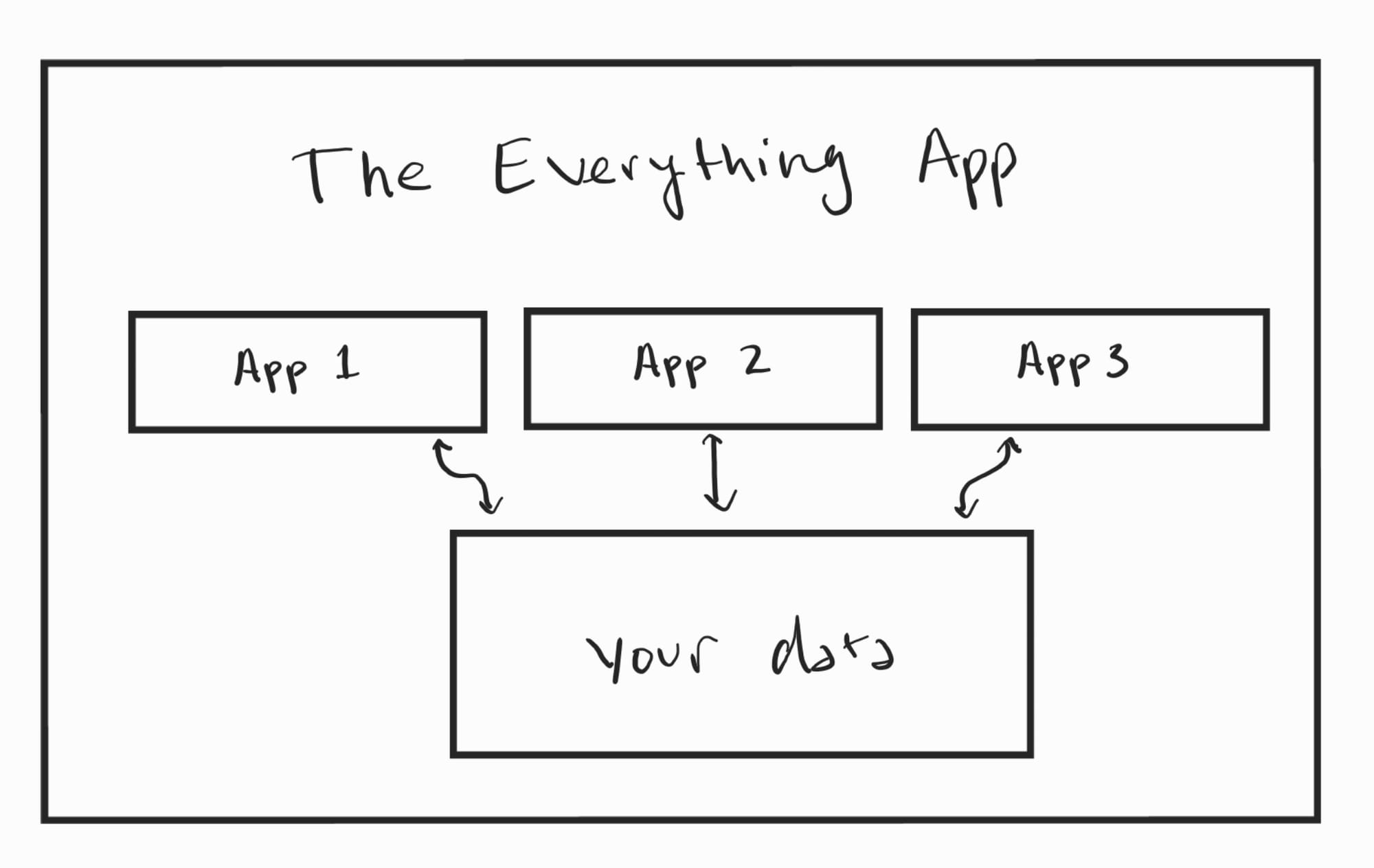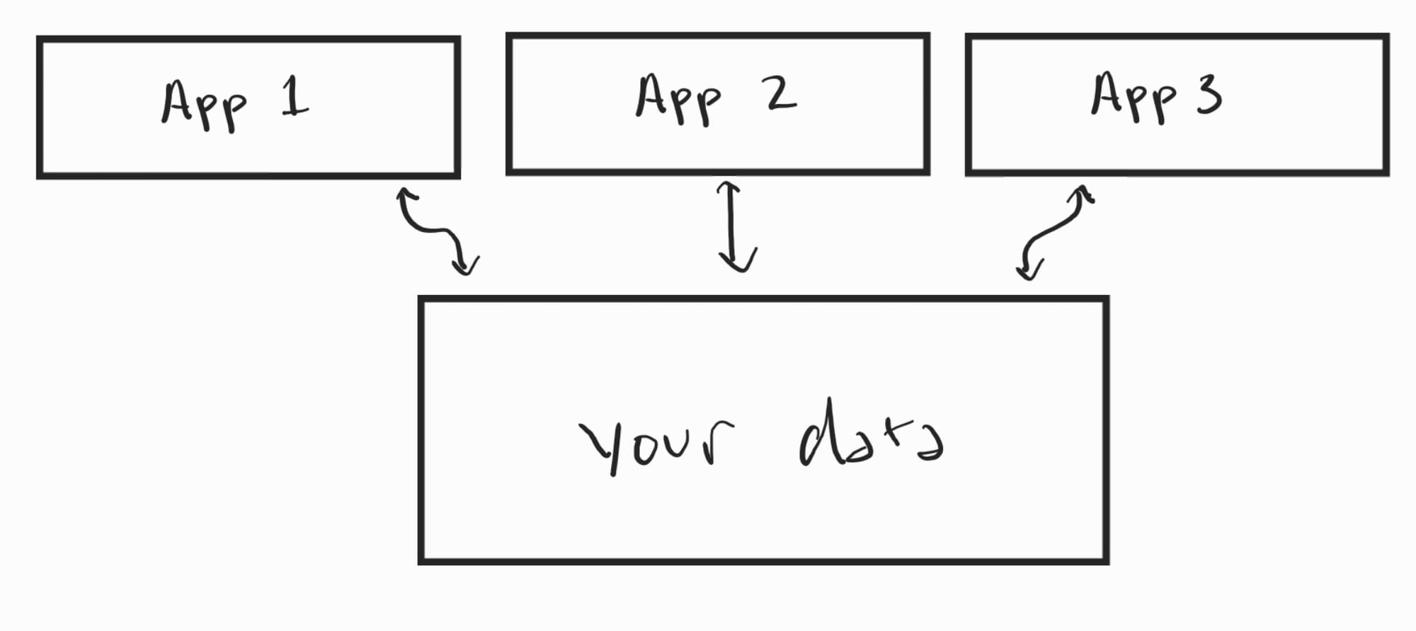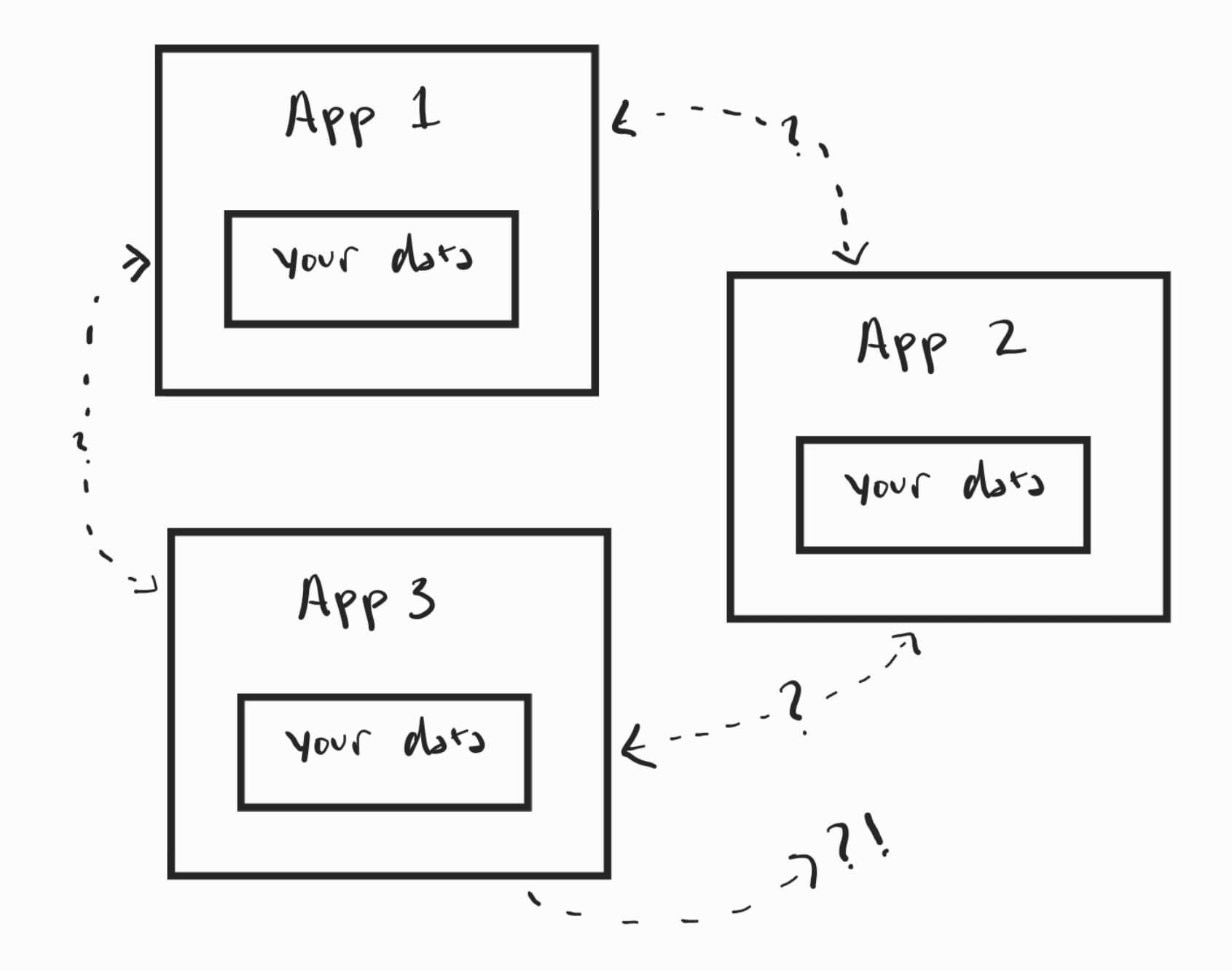 Each app is in its own silo, holds our data within it, and if we want a feature from App 1 to use data from App 2, we have to hope that the two companies cooperate. And if you ever want to leave App 3? Well, you have to hope they let you export your data and hope it's in a format that App 1 and App 2 can handle, or you're starting from scratch.